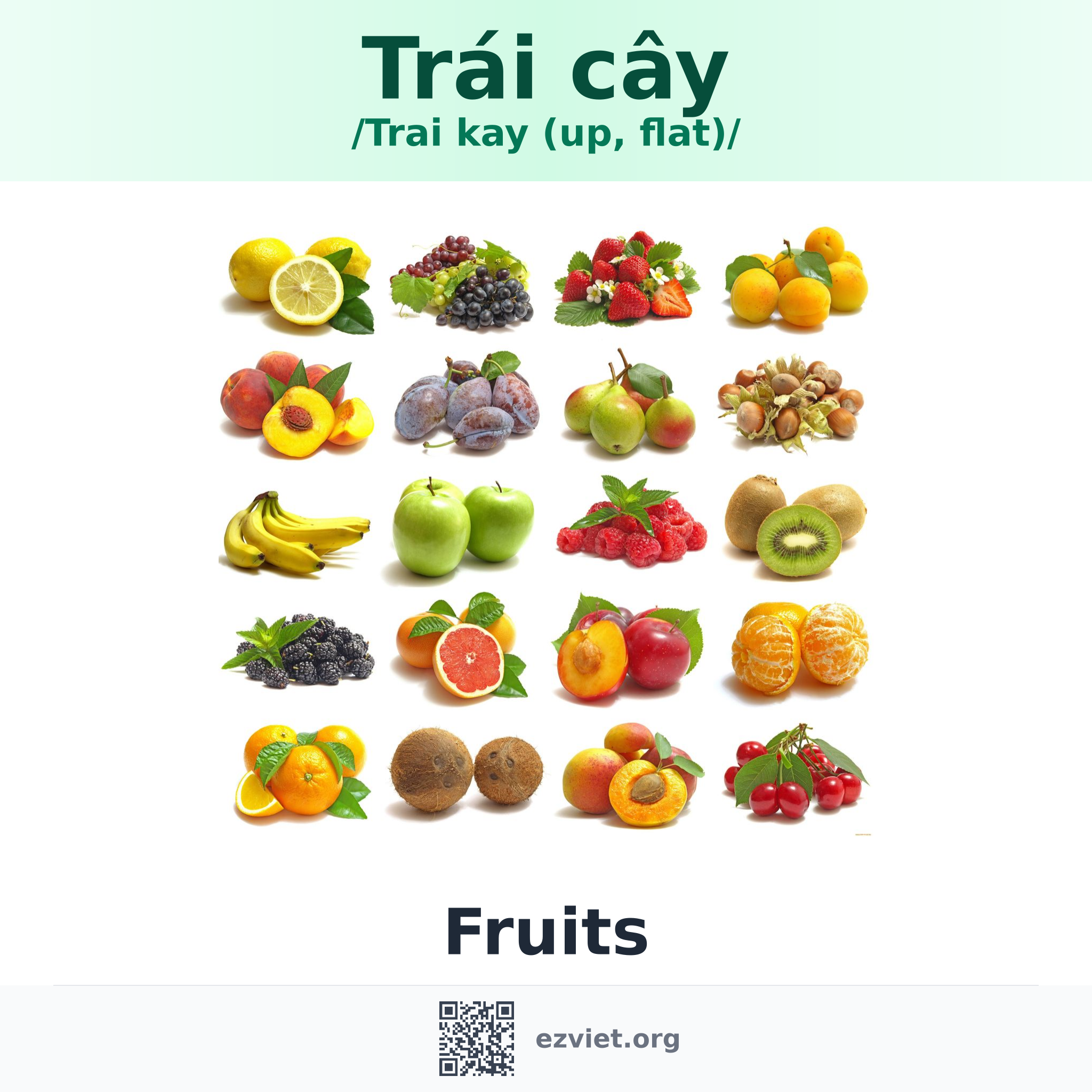 The Vietnamese word for Fruits is Trái cây (Trai kay (up, flat)).